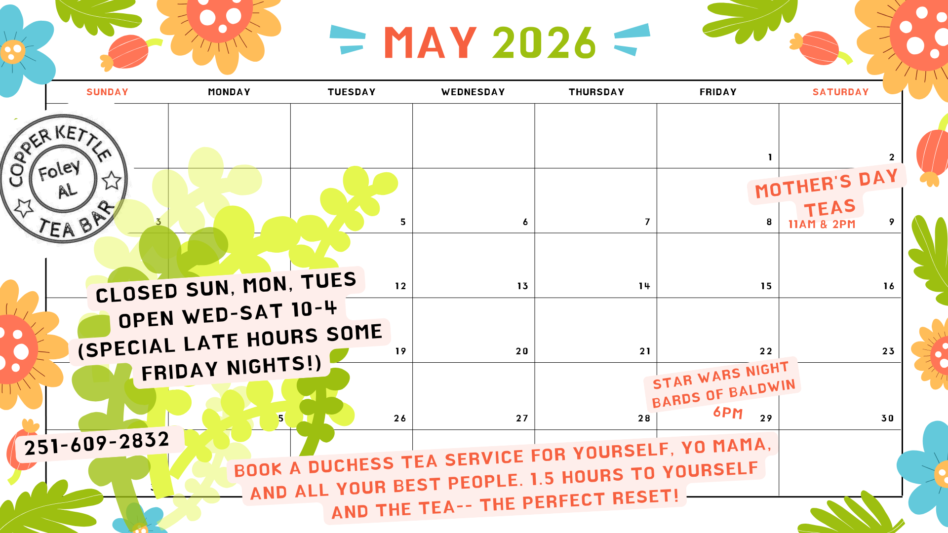 There are a few spots remaining for Mother's Day Tea services, 5/9/26, [...]